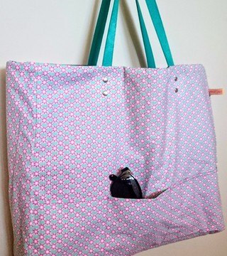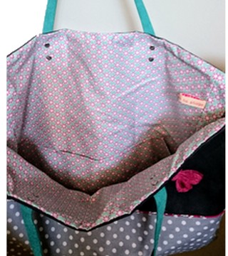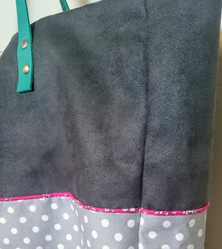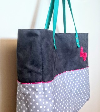 Coton enduit et suédine gris. Papillon velours rose. Doublure coton. Plusieurs poches intérieures. Anses en cuir.