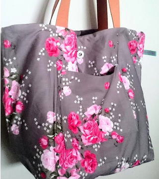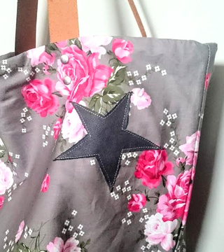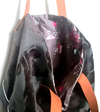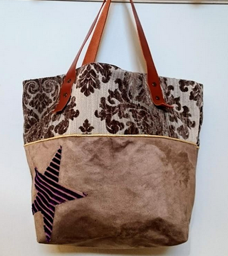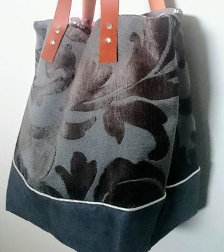 Toile épaisse de tapissier, suédine grise Passepoil argenté. Doublure coton Poche intérieure Anses en cuir.