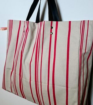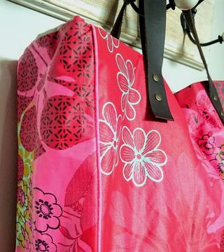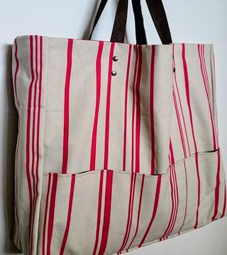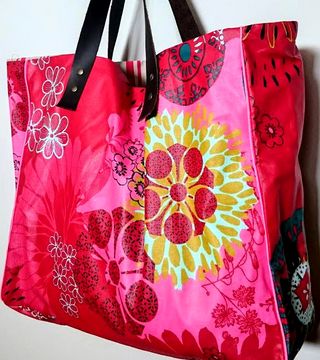 Belle toile enduite grands motifs Doublure coton beige rayures rouges Plusieurs poches intérieures. Anses en cuir.