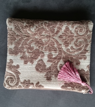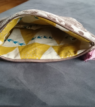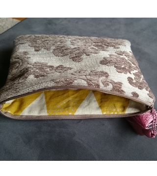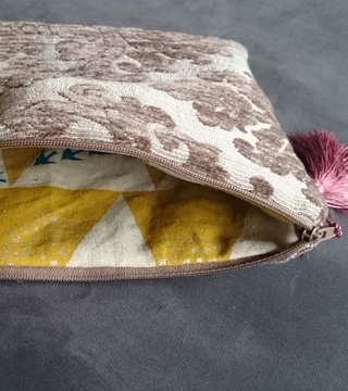Pochette toile de tapissier beige Fermeture éclair marron et pompon vieux rose Doublure coton beige et moutarde.