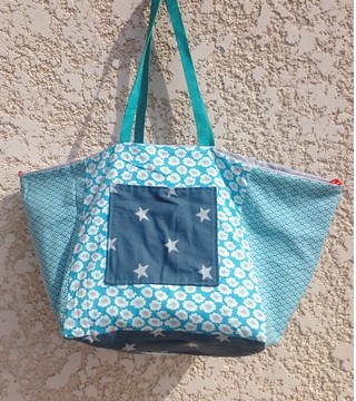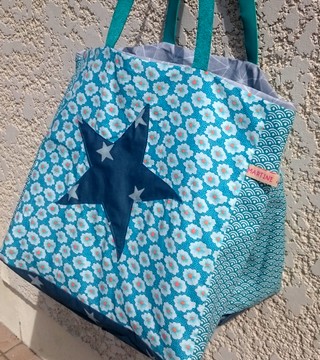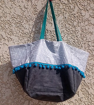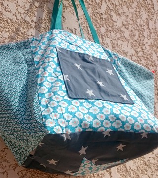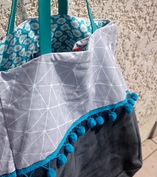 Suédine grise et toile enduite Doublure patchwork de différents cotons Grande poche intérieure Anses cuir bleu Lien de fermeture.